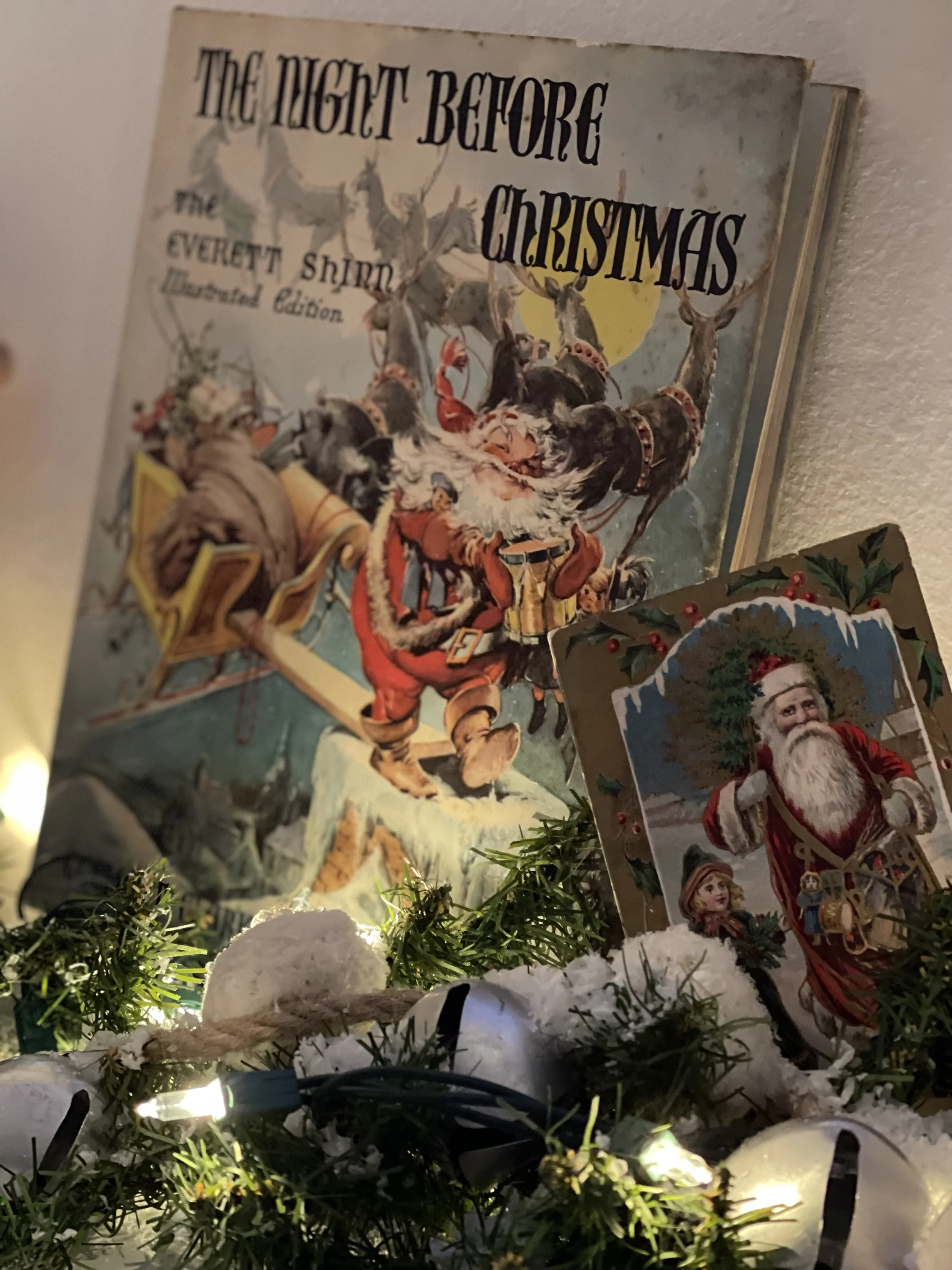 A number of treasures awaiting their unwrapping are less about my childhood, and more about remembering loved ones. A tiny sweet nativity, made of brown plastic & glitter is one of my most cherished family pieces. Given to me from my Great Aunt Alice, along with 2 porcelain ornaments. I remember her smile & kindness in wanting me to have something of hers. Holiday books over 120 years old from my mothers godfather, Dr. John, reminding me we were all young once. Postcards addressed to both great grandmothers Laura & Olive, as well as Olive’s sister Raye. Holiday greetings from family far away, delicately written on the backs of the festive cards. I tuck then into nests, garland & amongst bowls of ornaments. Finally, a cherished lamb candle holder from my late friend, Alison. It makes me smile of our innate way of showing up in the same clothes for our lunches or picking up the phone to call each other at the same moment—it connecting without ringing.