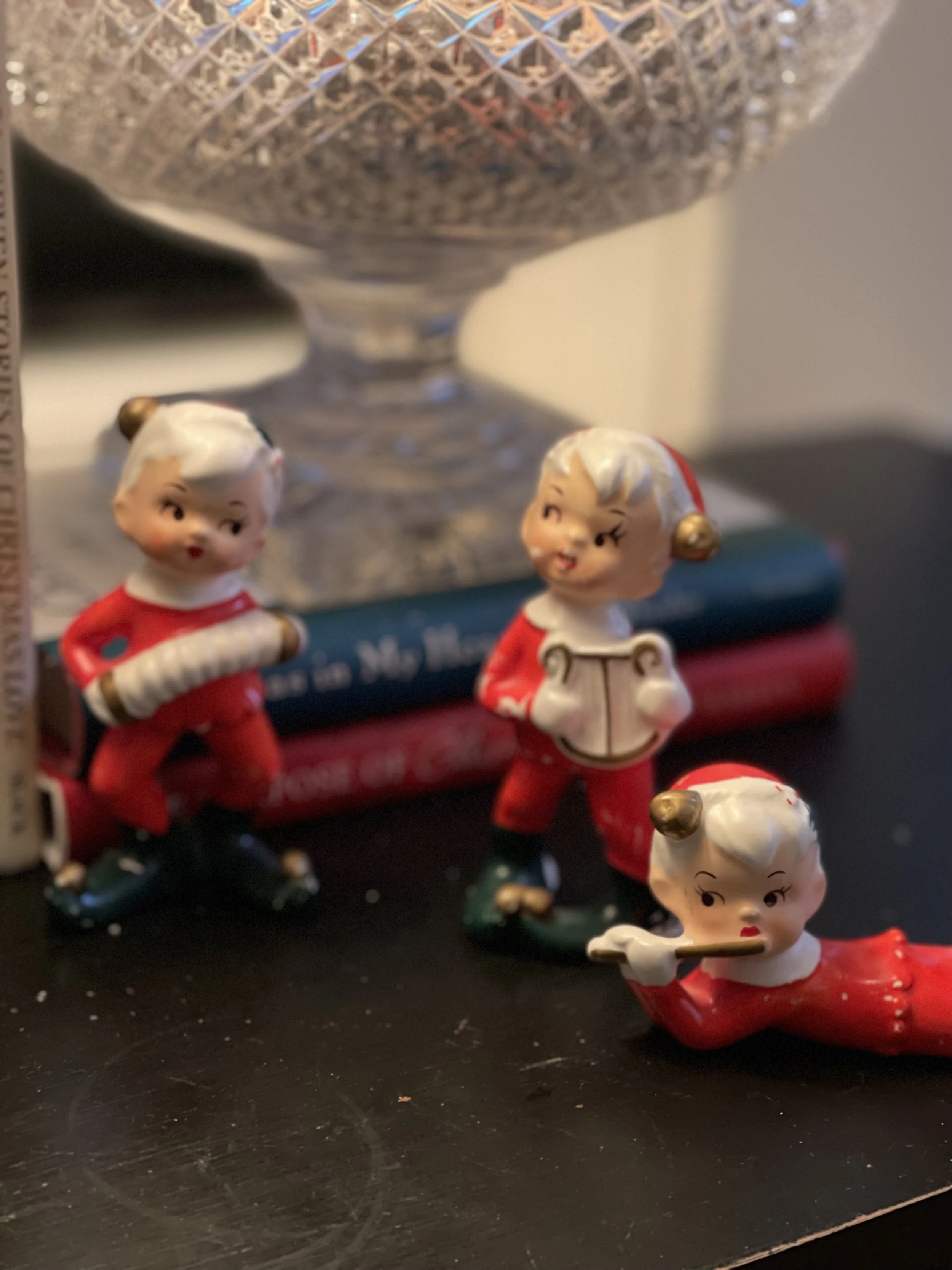 I recall my childhood Christmases the moment I unwrap the sweet glass angels with room for candles. They graced many a holiday table. Ceramic Victorian carolers painted by my mother in their unusual 1970s color palette. The set of joyful elves I unwrap each year and place on a stack of holiday books. My mother must have acquired them over 60 years ago, long before the Elf-On-A-Shelf phenomenon. A red felt stocking with “Pam” stitched by my dad’s cousin. (1 for each of the 3 of us). I still can feel the connection with my great grandfather Willie, with his addition of a Silver Dollar each year to its contents of simple treats.